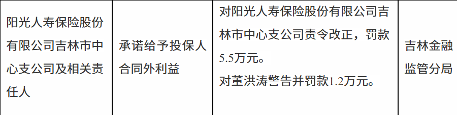 12月17日贝贝查,国家金融监督管理总局吉林监管分局行政处罚信息公示列表显示,阳光人寿保险股份有限公司吉林市中心支公司及相关责任人因承诺给予投保人合同外利益被罚款5.5万元。董某涛被警告并罚款1.2万元。