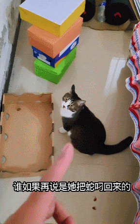 直到前几天,网友发现小猫对着角落里的一堆鞋盒炸毛,他感觉不太对劲,便拿了个铲子小心翼翼地把鞋盒推开。