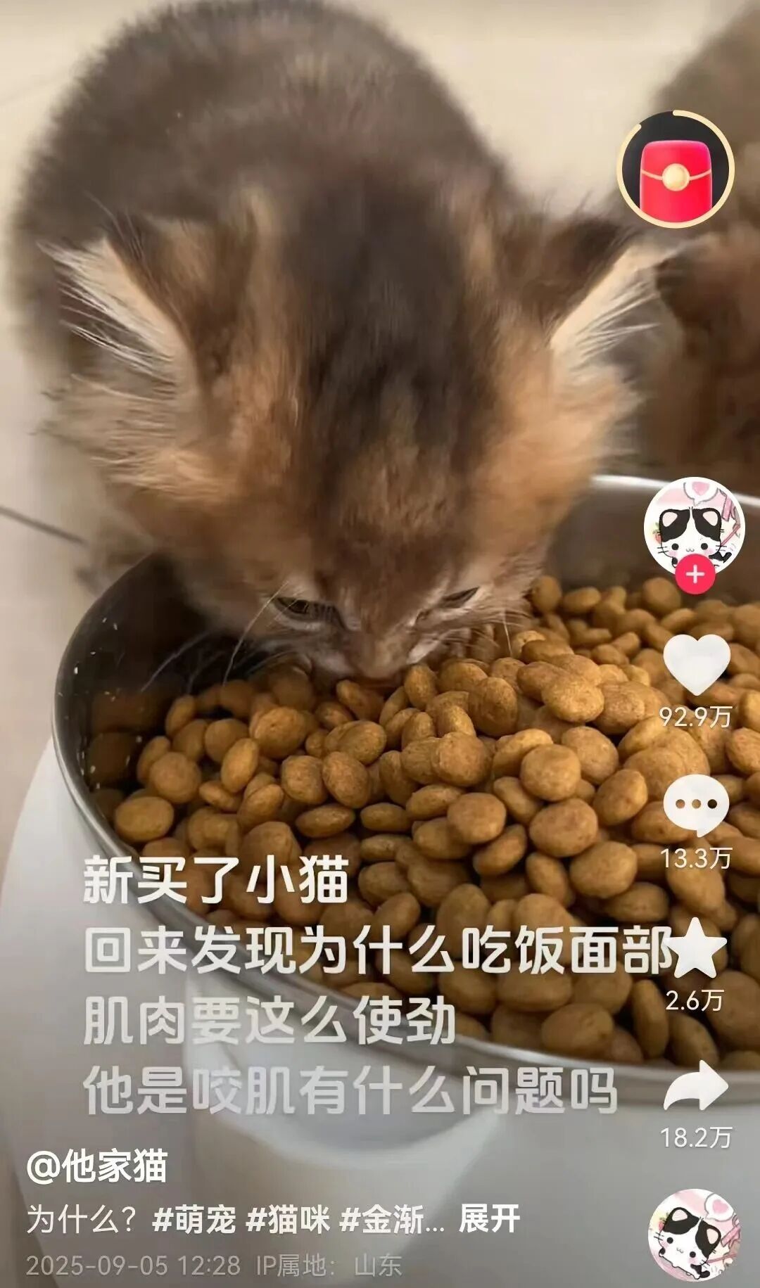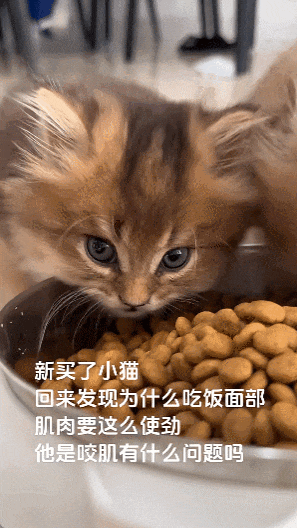 “新买了小猫,它为什么吃饭面部肌肉要这么使劲,它是咬肌有什么问题吗?”