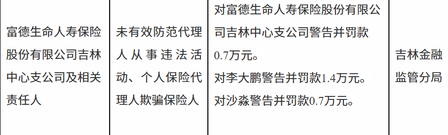 12月17日,国家金融监督管理总局吉林监管分局行政处罚信息公示列表显示宏牛操盘,富德生命人寿保险股份有限公司吉林中心支公司及相关责任人因未有效防范代理人从事违法活动、个人保险代理人欺骗保险人被警告并罚款0.7万元。李某鹏被警告并罚款1.4万元。沙某被警告并罚款0.7万元。